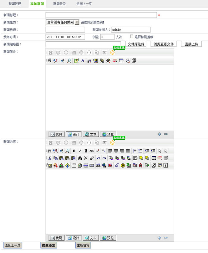 1.在“新闻标题”字段,填写新闻的标题。2.在“新闻属类”字段,设置新闻的类别。3.在“新闻来源”字段,设置新闻的来源。4.在“发布时间”字段,设置新闻的时间。5.在“浏览人次”字段,设置新闻浏览次数。6.在“是否特别推荐”字段,设置新闻是否推荐。7.在“新闻缩略图”字段,可以选择直接上传和文库选择,添加您新闻的图片。8.在“新闻简介”字段,可以在线编辑您新闻简介内容。9.在“新闻内容”字段,可以在线编辑您新闻详细内页的内容。