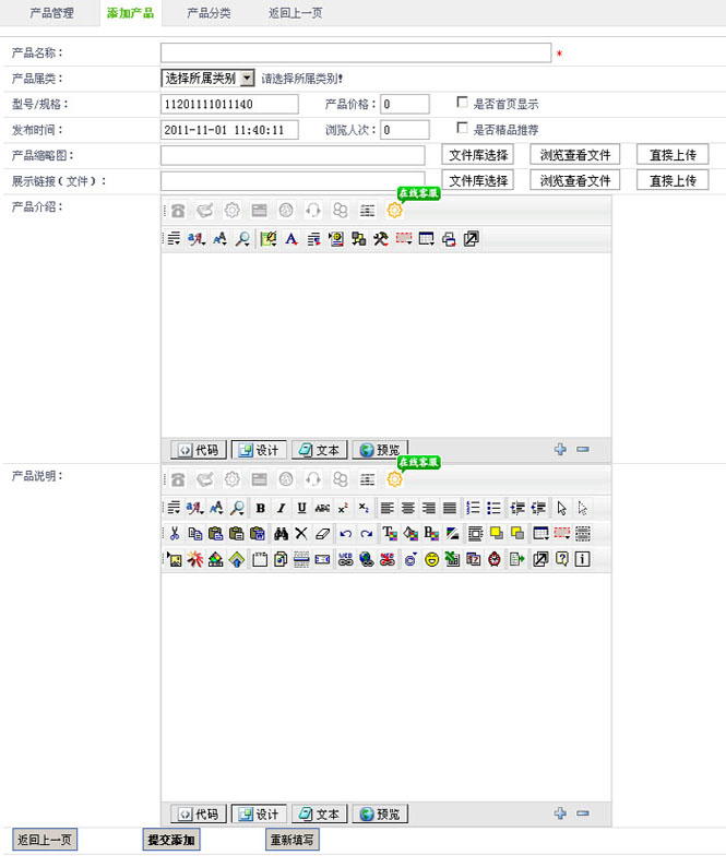 12.在“产品内容”字段,可以在线编辑您产品详细内页的内容