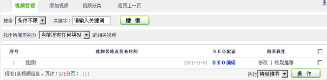 1.在“搜索”字段,搜索特定的某条视频,以便进行管理。2.在“找出所属类别为”字段,使用视频类别对视频列表进行虑选,选取特定的分类,以便进行管理。3.在“在视频列表”,设置视频的SEO配置(详细【3.4.1】章节进行介绍)、修改、是否推荐,删除等操作。