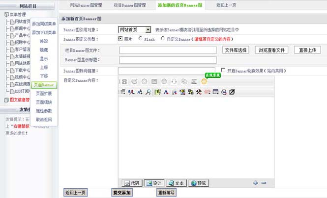 左则菜单管理>鼠标右键>页面Banner>添加新的栏目Banner图,如下图;