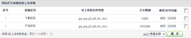 在每个上传参数的配置里面,可以针对不同栏目进行不同的水印功能设置。可控制开启或关闭。(详细【3.2.6】章节进行介绍)