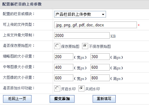 点击“配置新栏目的上传参数” 可以添加新的栏目上传参数(如下图): 可以设置不同等级的图片大小,包括缩略图大小。